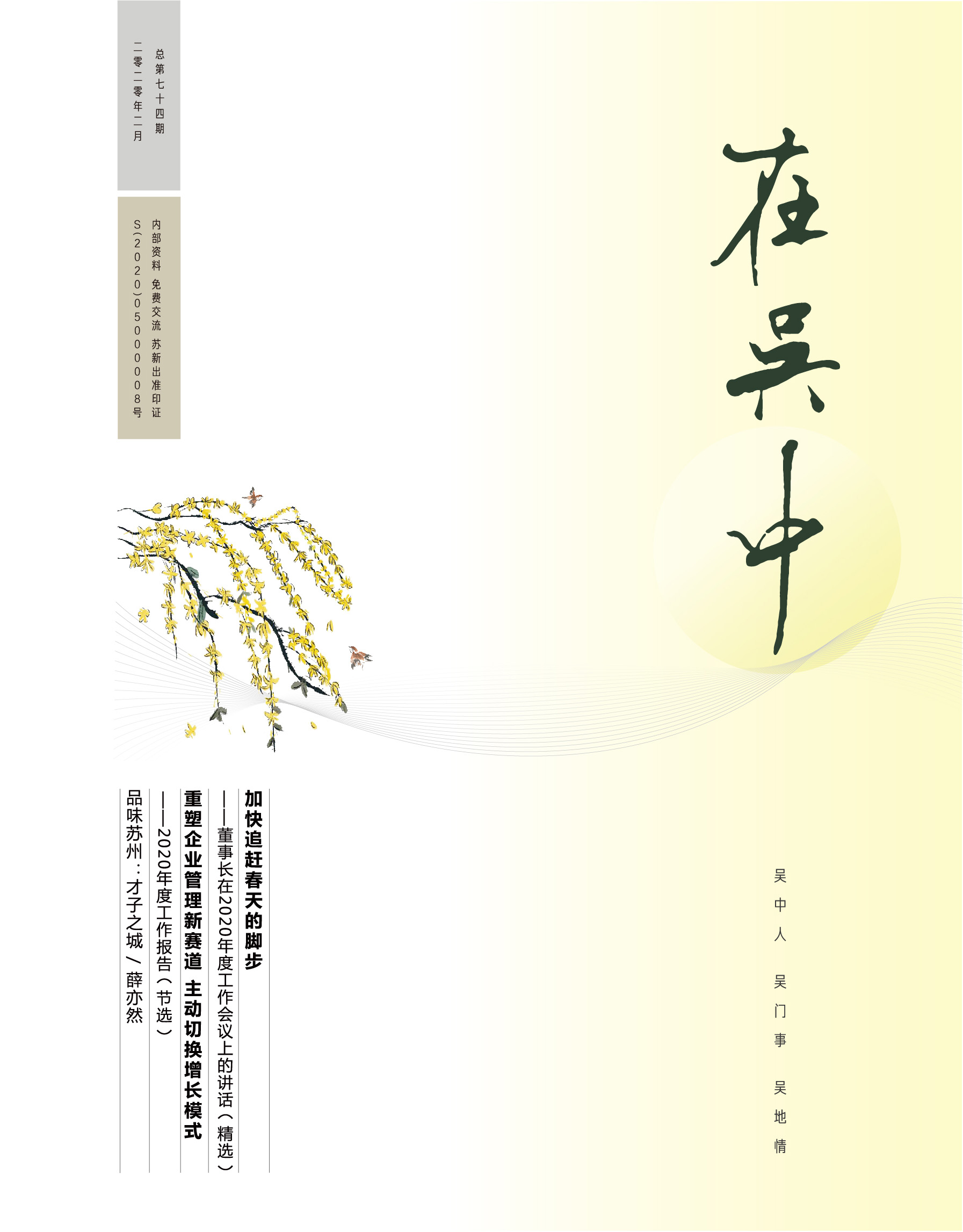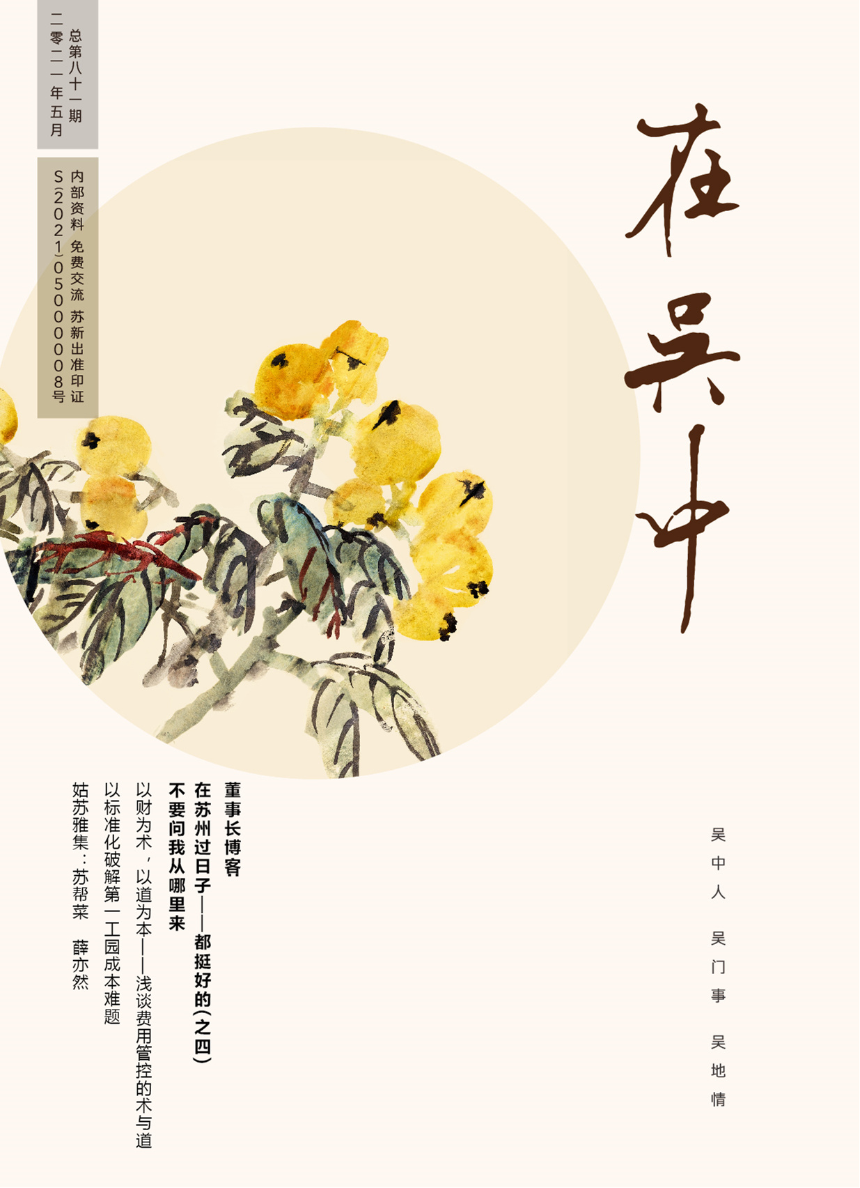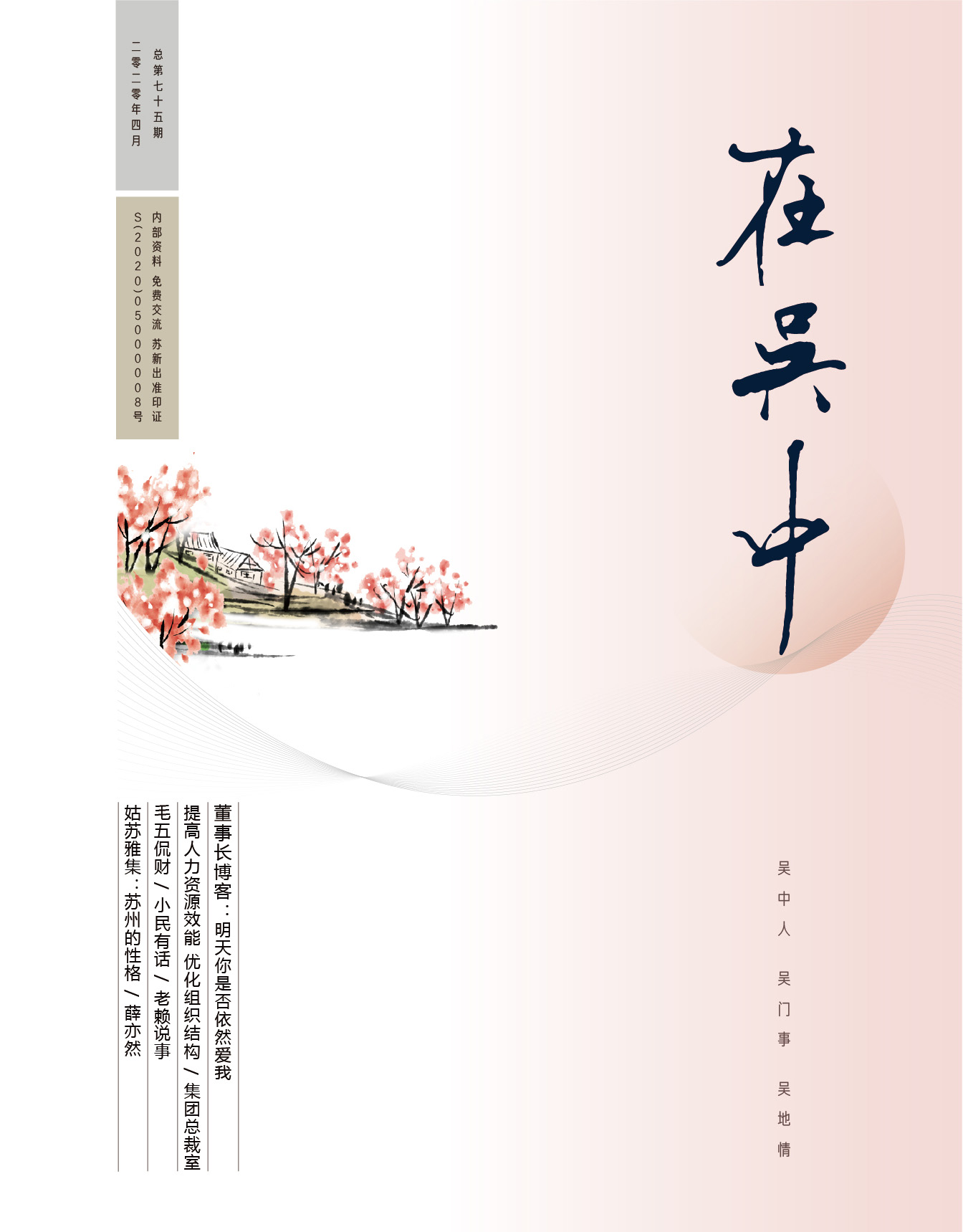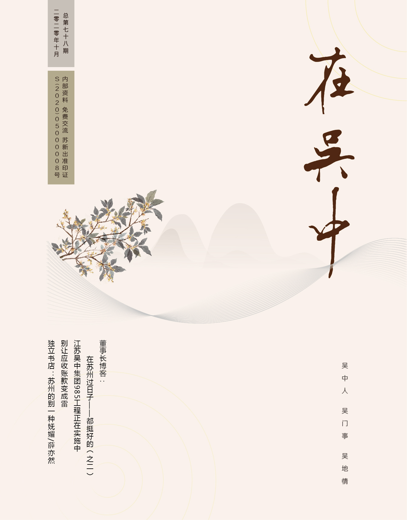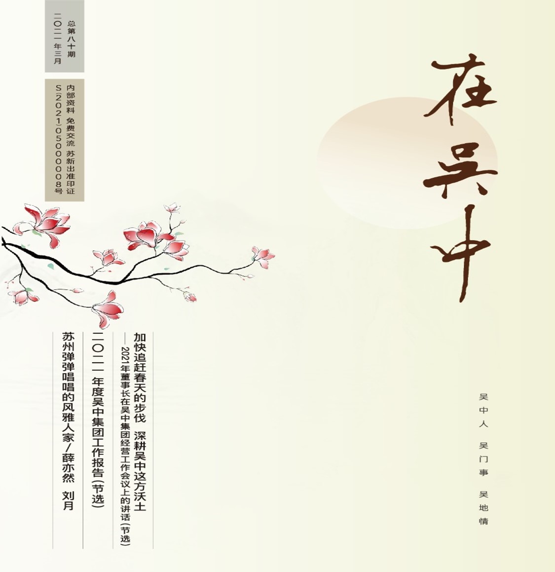 《在吳中》創(chuàng)刊于2005年,蘇州市十佳內(nèi)刊。以述吳中人、記吳中事、傳吳中情為宗旨,堅持記錄吳中集團的發(fā)展,為品牌建設(shè)發(fā)展助力?!对趨侵小穯纹谟∷?500冊,主要用以企業(yè)內(nèi)部交流,其意在傳達的吳中集團的力量、文化和精神。每期《在吳中》都記載著吳中人工作、學(xué)習(xí)、生活的實時動態(tài),所見所聞、所思所想、所作所為,總結(jié)借鑒企業(yè)經(jīng)營管理之道,汲取吳地人文精髓,廣受社會各界的好評和認(rèn)可。