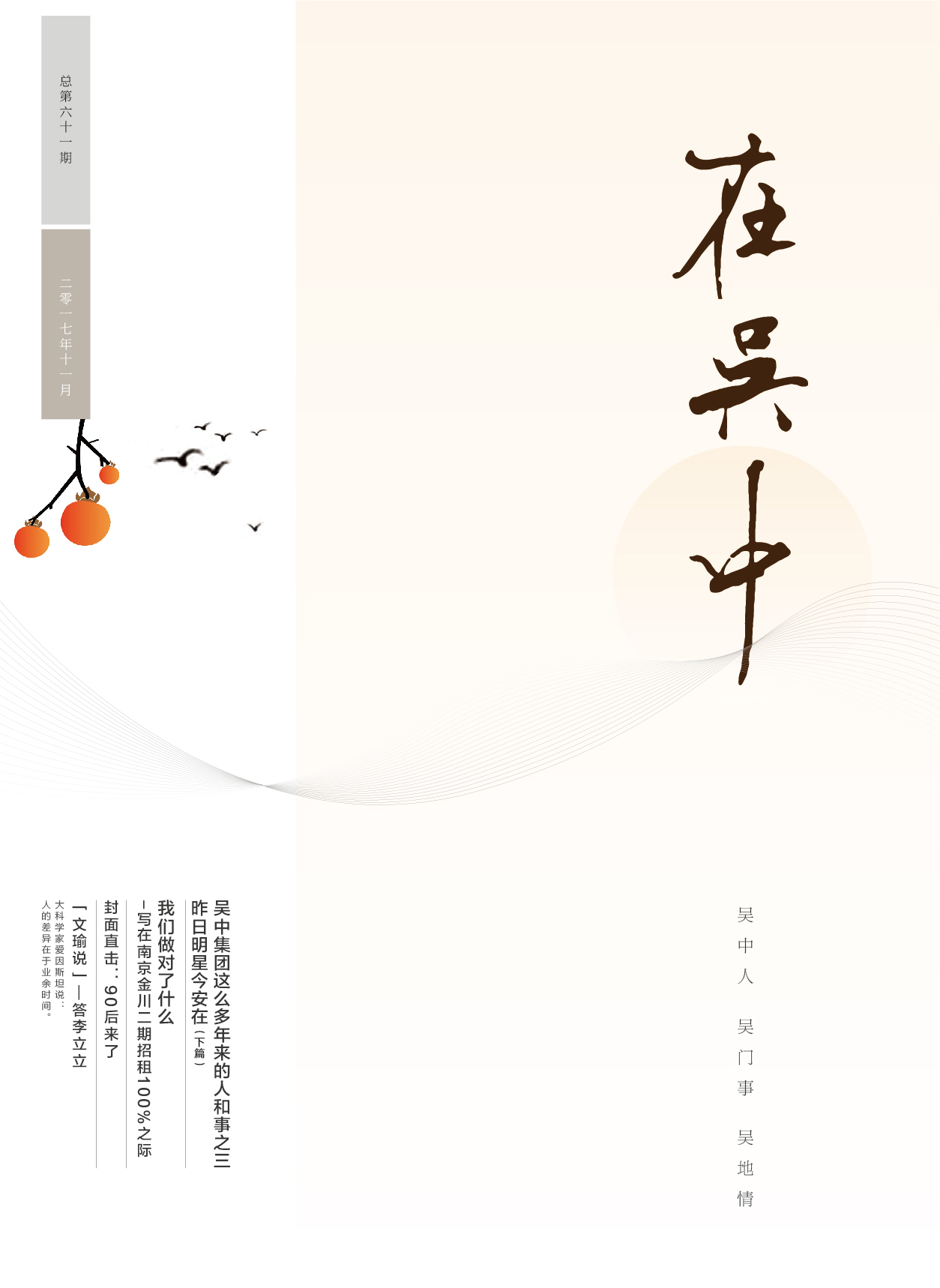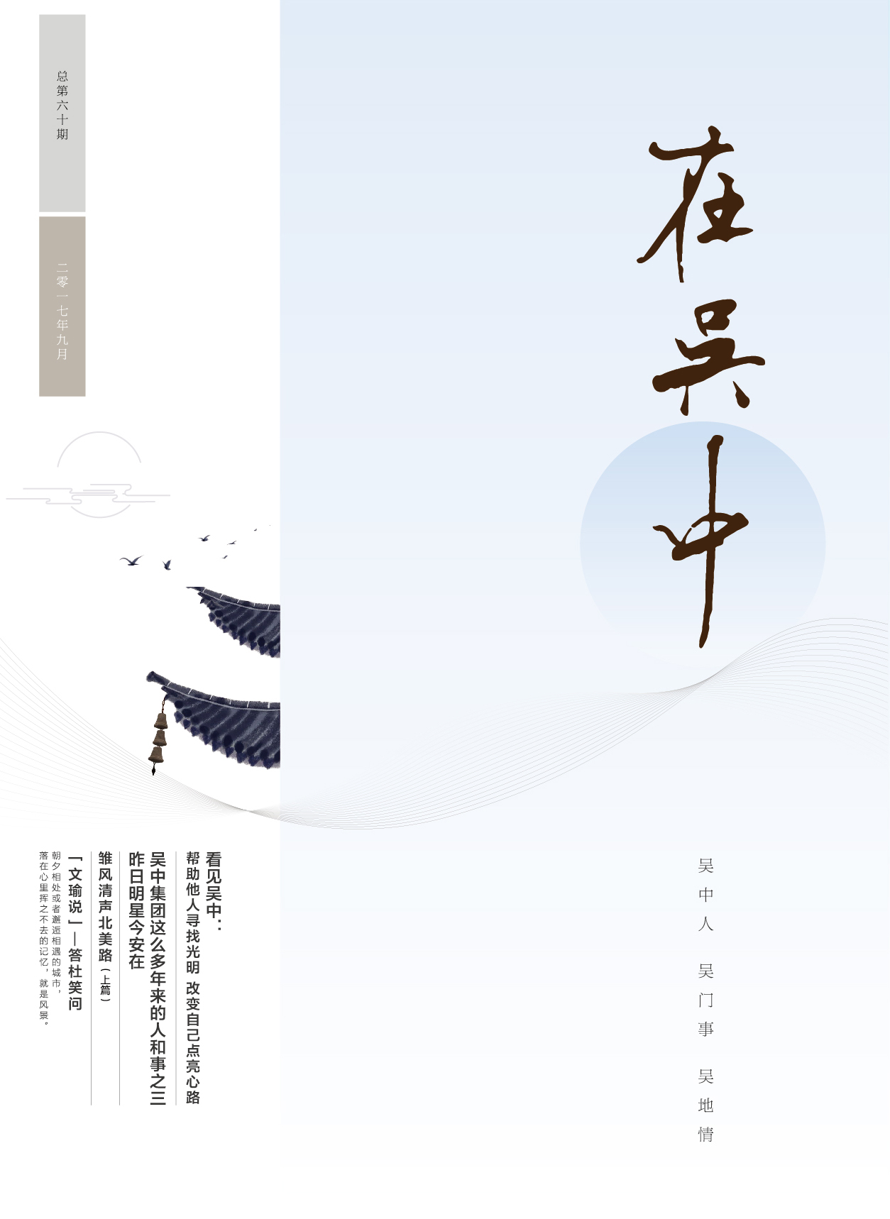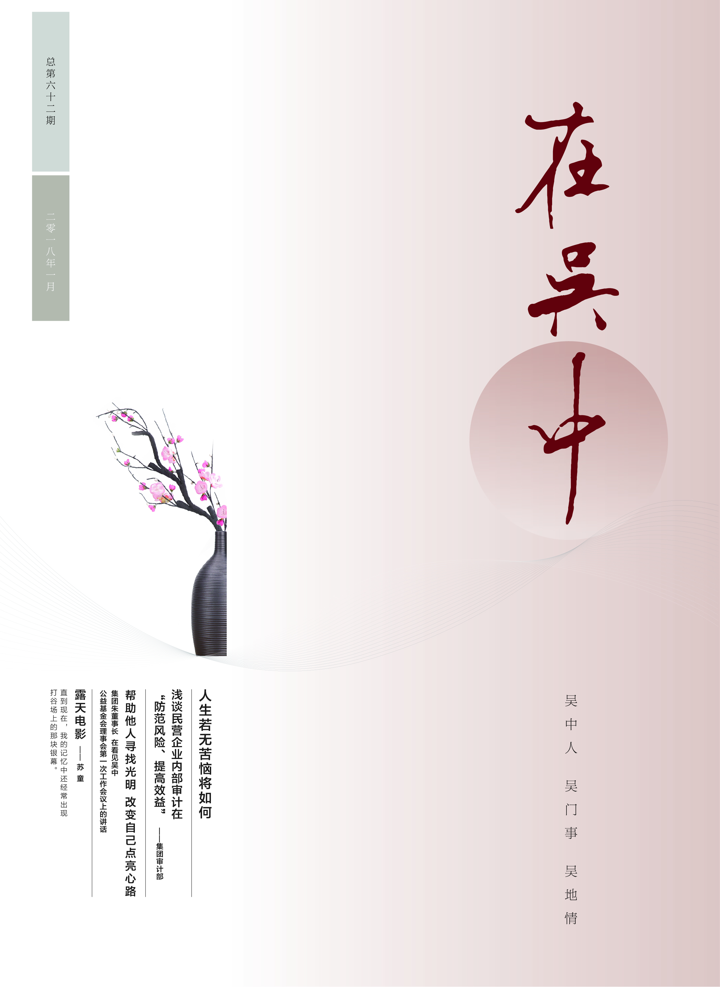 《在吳中》創(chuàng)刊于2005年,蘇州市十佳內(nèi)刊。以述吳中人、記吳中事、傳吳中情為宗旨,堅持記錄吳中集團的發(fā)展,為品牌建設(shè)發(fā)展助力?!对趨侵小穯纹谟∷?500冊,主要用以企業(yè)內(nèi)部交流,其意在傳達的吳中集團的力量、文化和精神。每期《在吳中》都記載著吳中人工作、學(xué)習(xí)、生活的實時動態(tài),所見所聞、所思所想、所作所為,總結(jié)借鑒企業(yè)經(jīng)營管理之道,汲取吳地人文精髓,廣受社會各界的好評和認可。